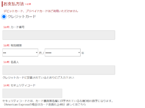 クレジットカード情報を入力する際は、「カード番号」「有効期限」「名義人」「セキュリティコード」を入力が必須です。